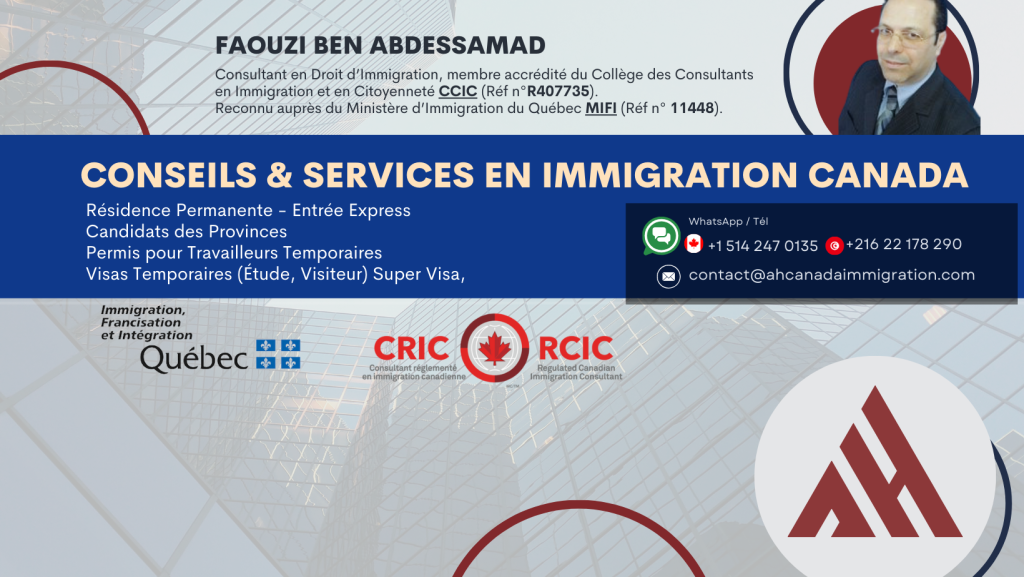 Notre équipe, composée de professionnels certifiés et spécialisés en immigration canadienne, est dirigée par M. Faouzi Ben Abdessamad, consultant en droit d’immigration et membre accrédité du Collège des Consultants en Immigration et en Citoyenneté (CCIC), sous la référence R407735. Il est également reconnu par le Ministère de l’Immigration, de la Francisation et de l’Intégration du Québec (MIFI) sous la référence 11448.